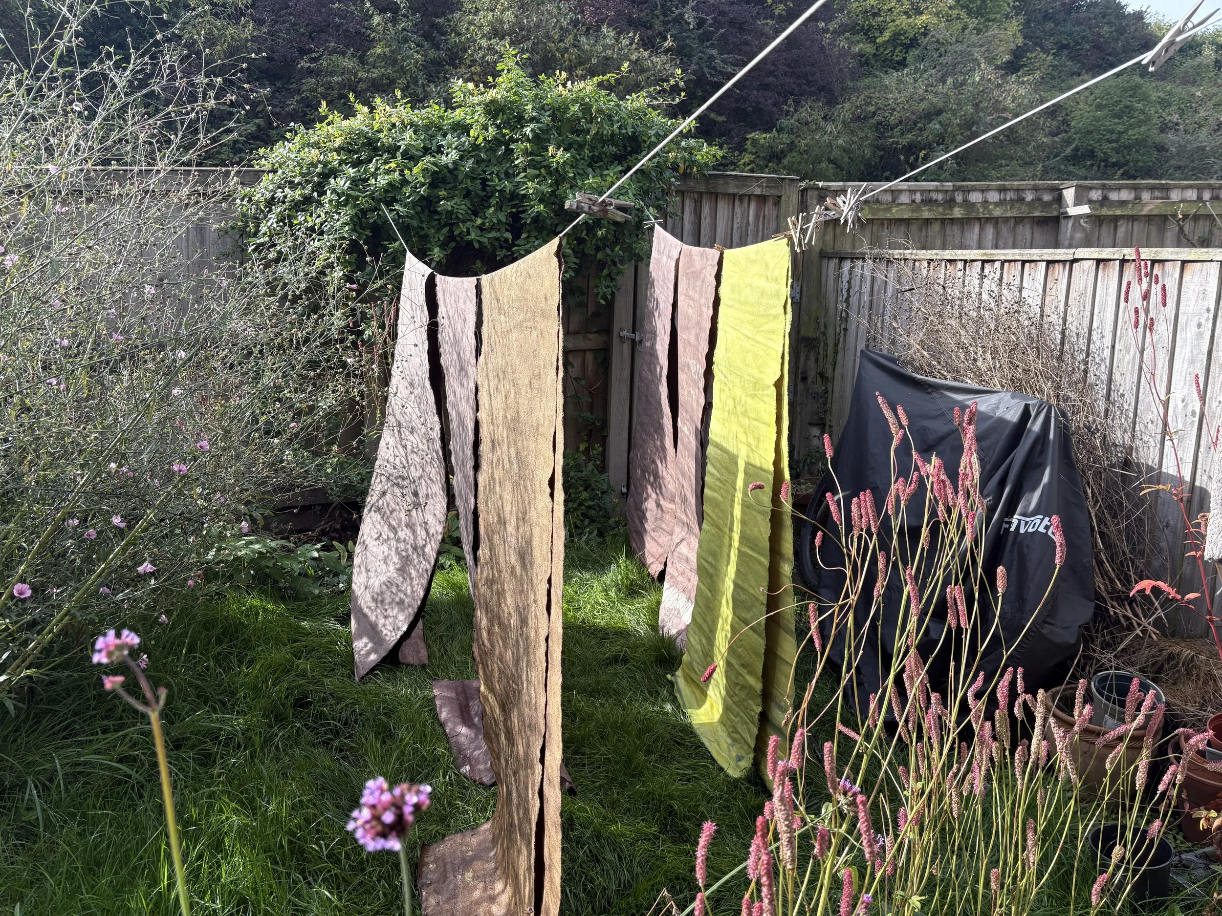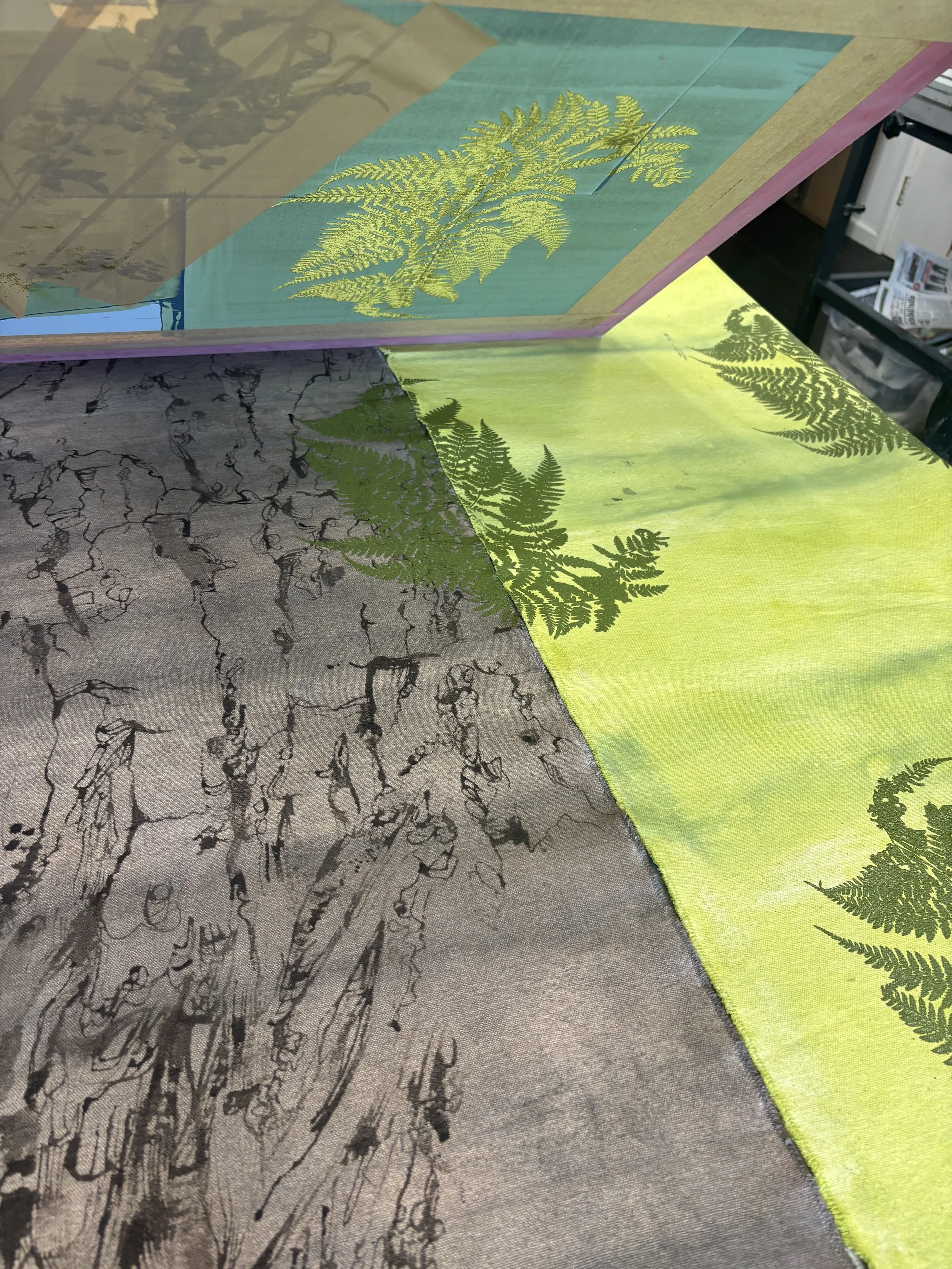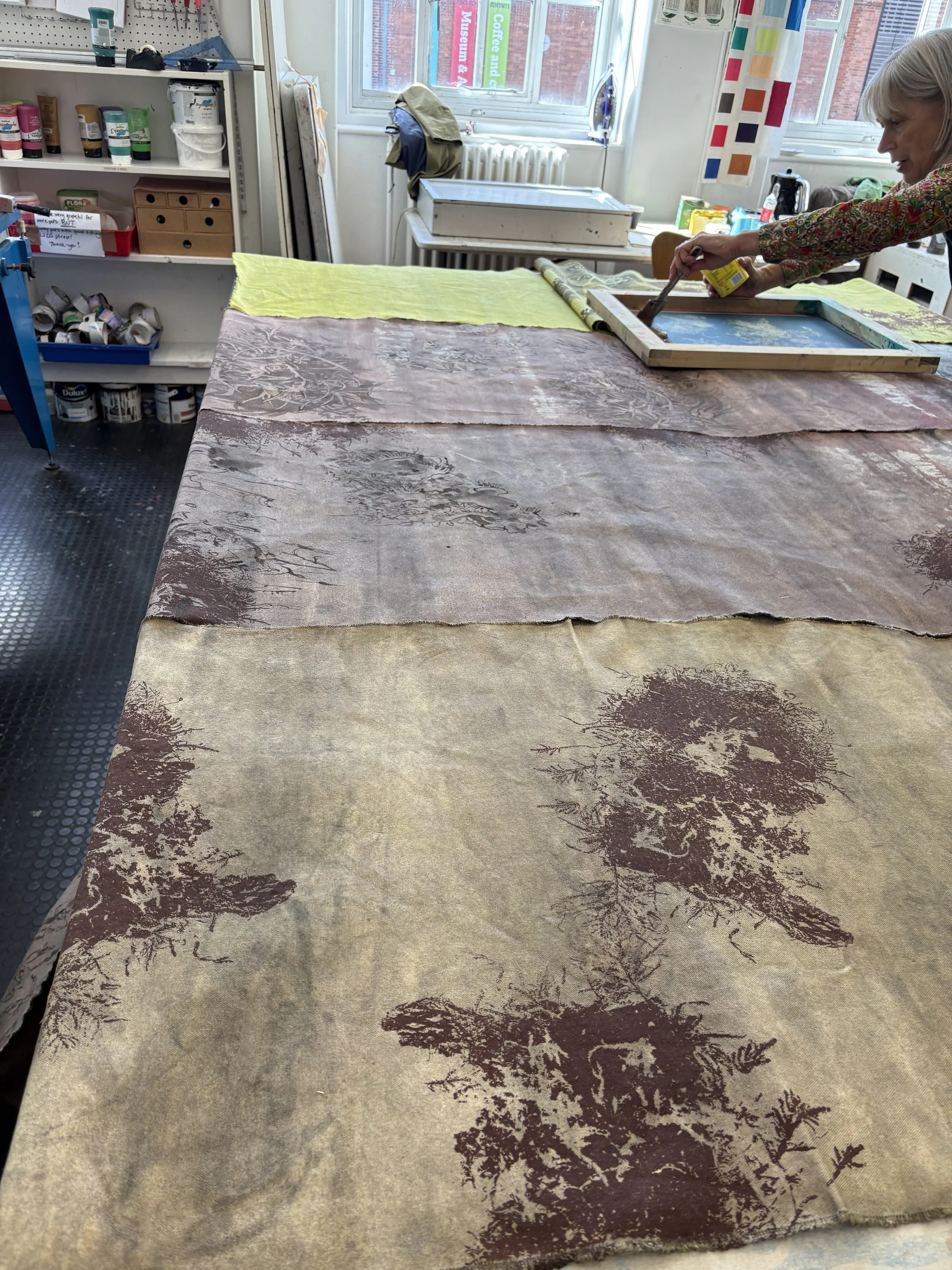 Then Arun, Ellen and I experimented with pigments, inks and exposure times for the drawings and plants to create screens, at Double Elephant Print Workshop. helped by the amazing Esme Cooper! I then dyed the fabric at home - layer after watery layer, dripping dry on my washing line and everything around it. We were all quite Otterhead coloured by September in our house.