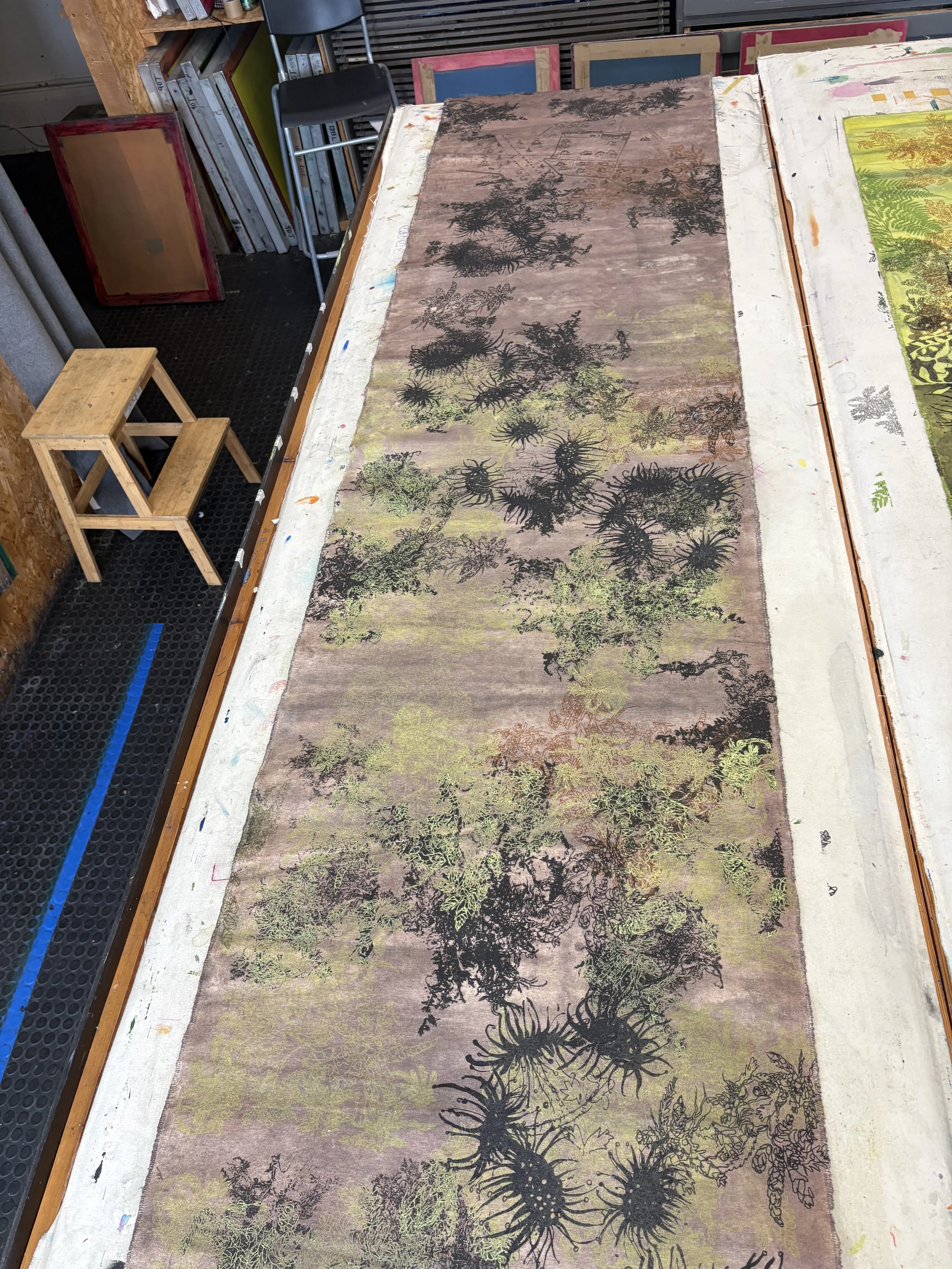 As always when screenprinting I love working with Esme at Double Elephant. Not only is it always more fun to work with a fellow printmaker, but Esme is super experienced at screenprinting on fabric. It would also have been impossible to print freehand like this (holding the screen while pulling the squeegee, and at speed).